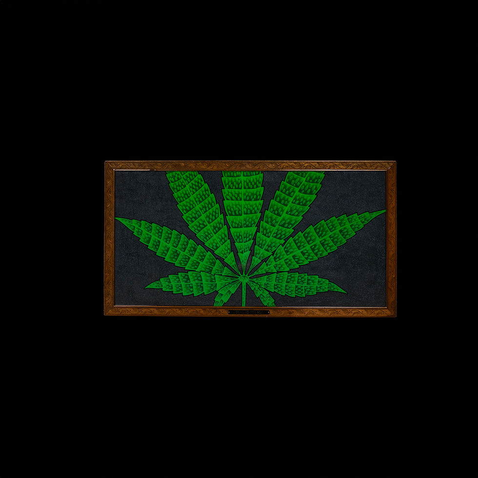 This striking hand-painted green leaf artwork features a large, detailed leaf centerpiece set against a bold black background, creating a dramatic contrast that highlights every line and texture of the design.